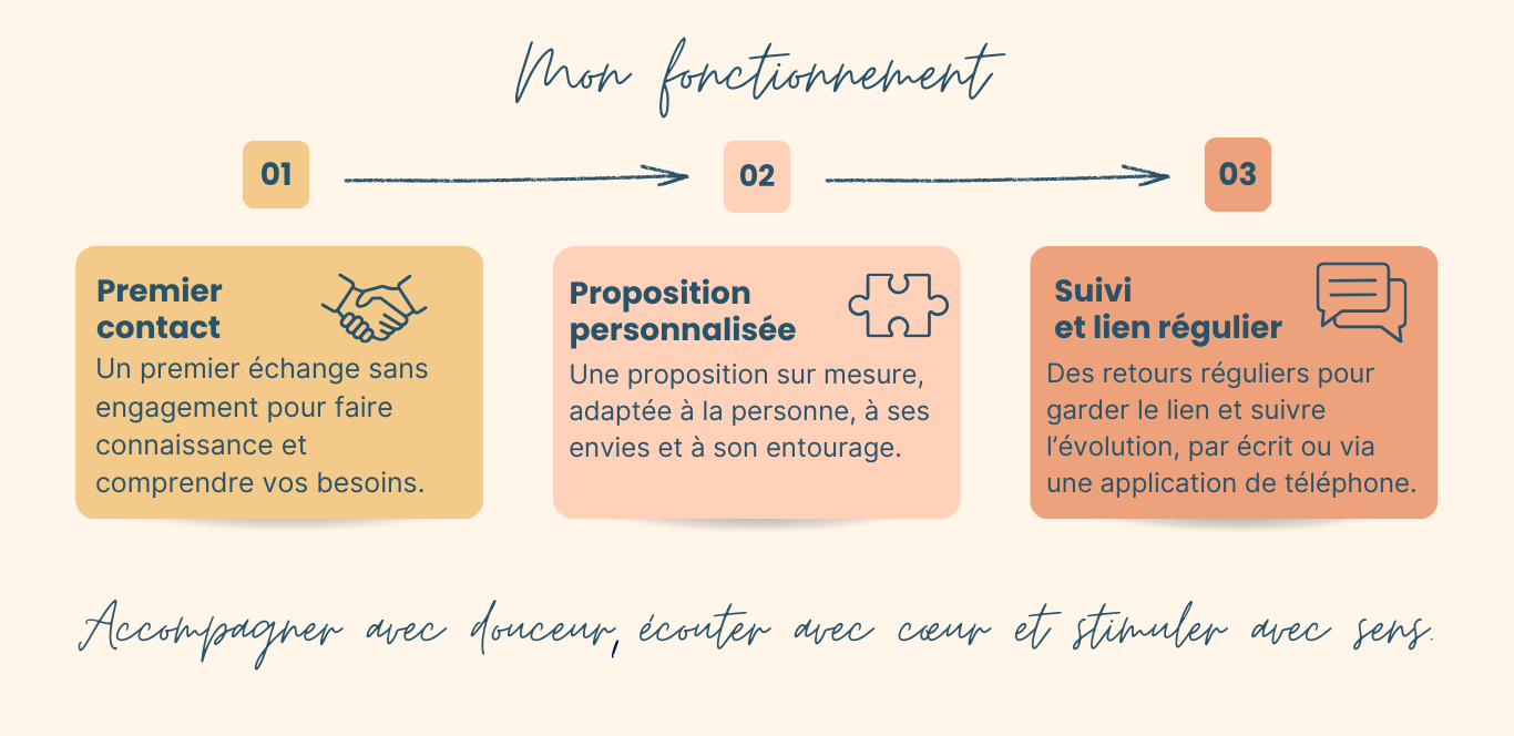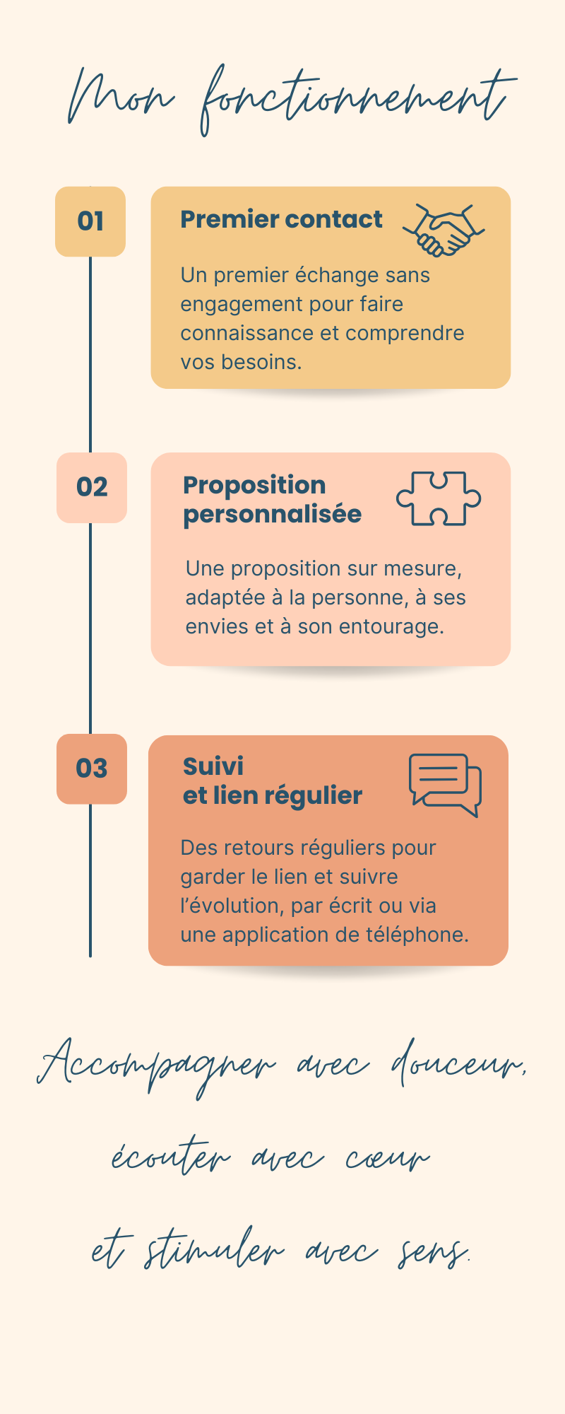 Je travaille également en lien avec les proches aidants, les professionnels du secteur médico-social, les établissements et résidences autonomie, pour créer des accompagnements sur mesure, adaptés à chaque situation.